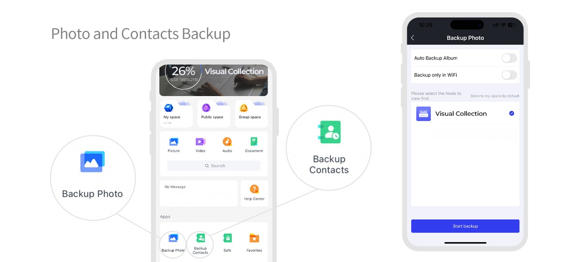 The mobile app can backup your new phone album, the attachments such as files, photos, and videos from WeChat chat records (supports Android) and more. After turning on the automatic backup function, the backup is on the go.