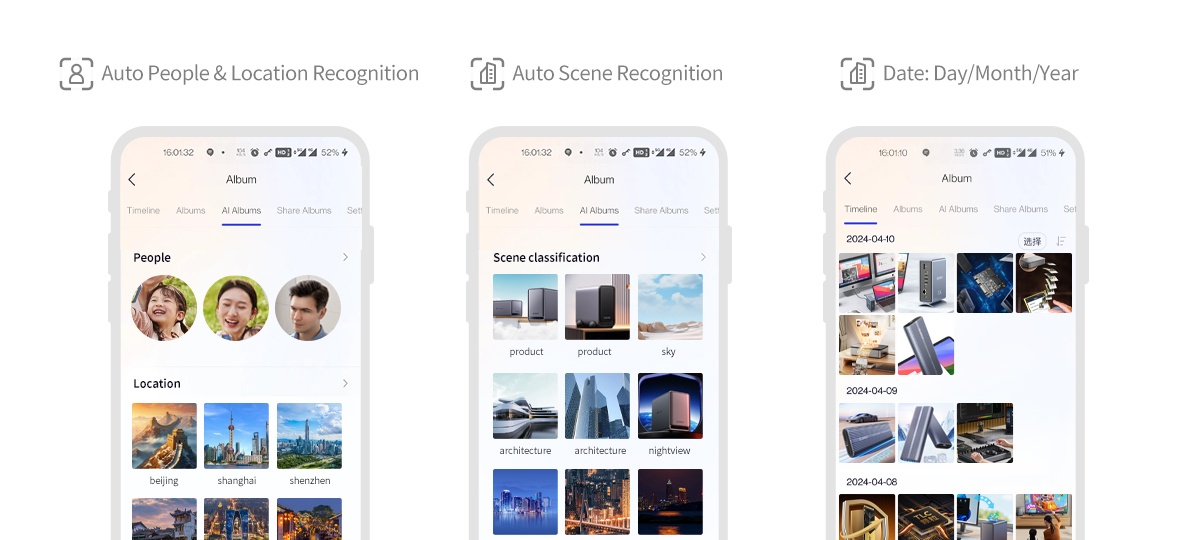 The photo album is automatically analyzed and categorized based on multiple dimensions such as time, scenes, people, themes, locations. It greatly simplifies your search. You will discover an array of stunning snapshots faster, reminisce about your cherished memories anytime.