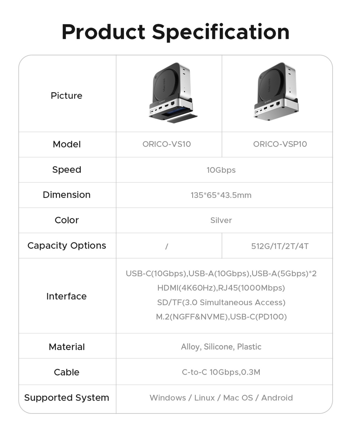 USB-C (10Gbps) , USB-A (10Gbps) , USB-A (5Gbps) *2, HDMI (4K60Hz) , RJ45 (1000Mbps) , SD/TF (3.0 Simultaneous Access) , M.2 (NGFF&NVMe) , USB-C (PD100)