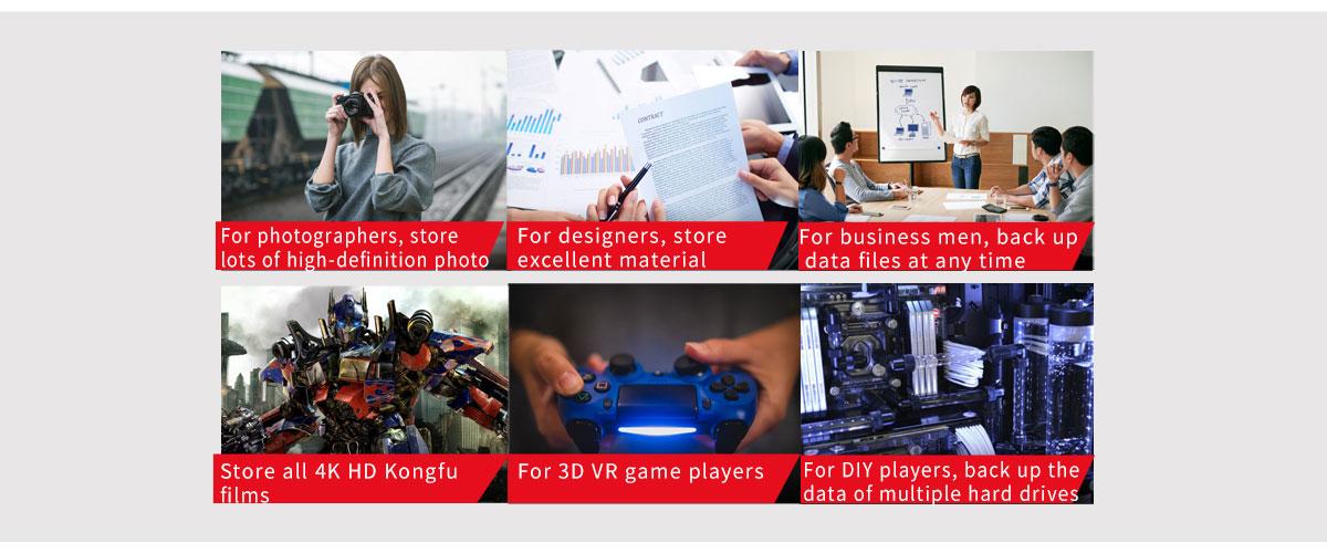 Original controller and years experience of designing storage devices make it stable. Support 8TB single disk storage; Designed with overload detection and multiple protections, keep your data safe.