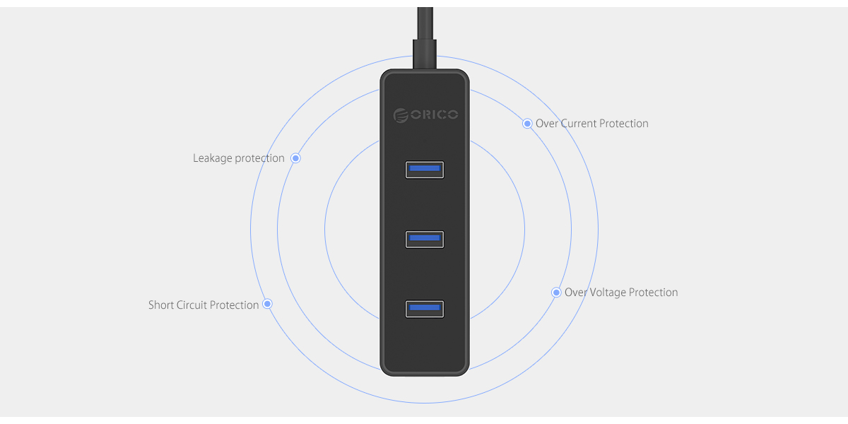 Built-in over voltage, over current, leakage and short circuit protection keeps hub and attached devices safe.