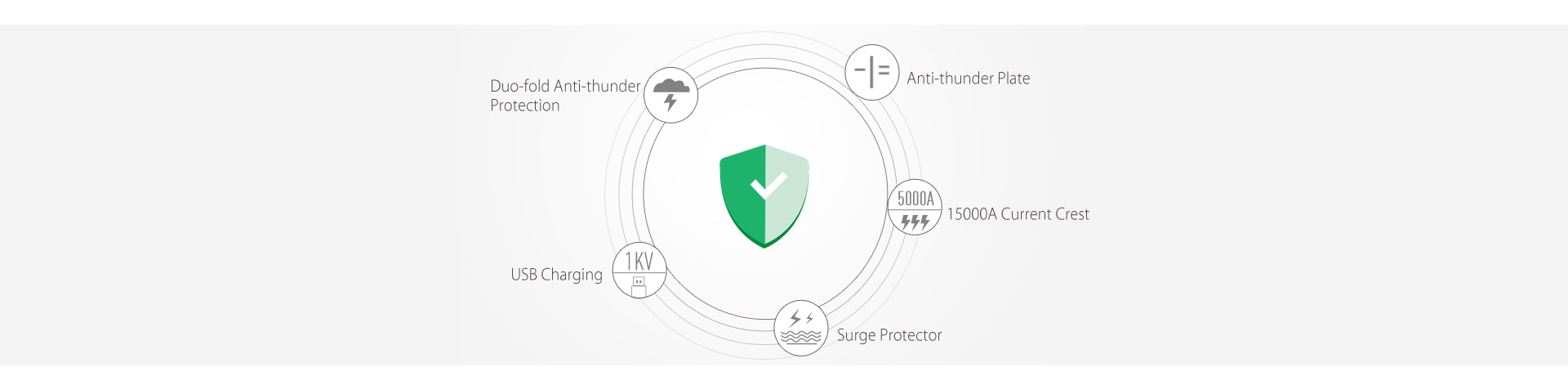 Double lightning protection, lightning board: 3KV, USB charge: 1KV; with the resistance of 15000A spike current and 1700-Joule surge-suppression rating, the unit optimally transfers power and helps keep TV, computer, phone, tablet and other appliances safe.