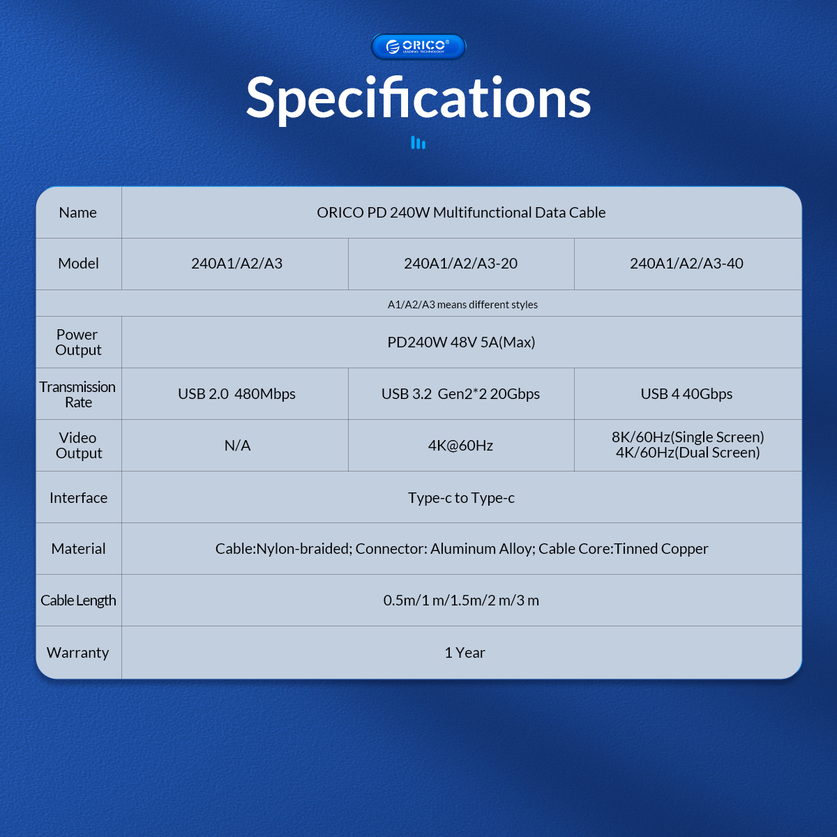 ORICO USB-C 240W High Speed 40G Multi-function Data Cable