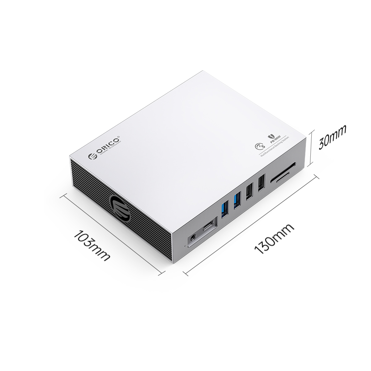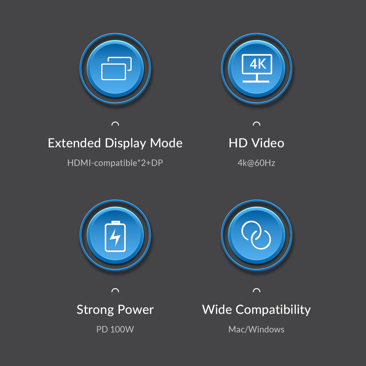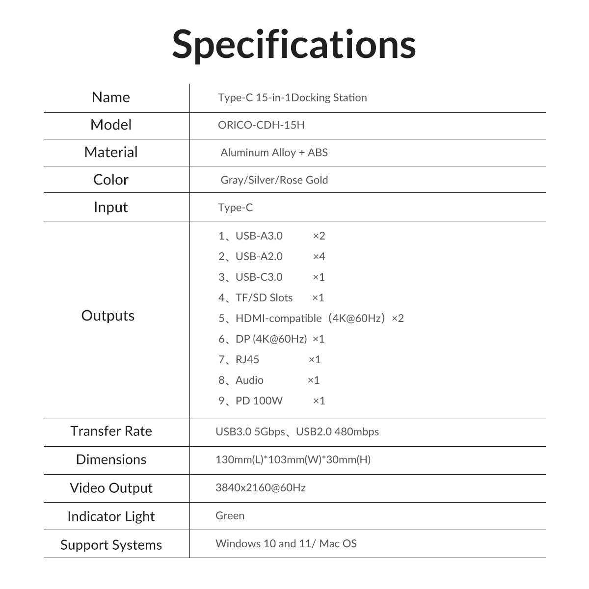 USB-A 3.2 Gen1x1 5Gbps x 2 USB-A 2.0 480Mbps x 4 USB-C 3.2 Gen1x1 5Gbps x 1 TF/SD(USB2.0) (TF/SD single read) 480Mbps x 1 HDMI 4K/60Hz x 2 DP 4K/60Hz x1 RJ45 LAN Port(1000Mbps) x 1 3.5mm Audio x 1 USB-C PD3.0 100W x 1