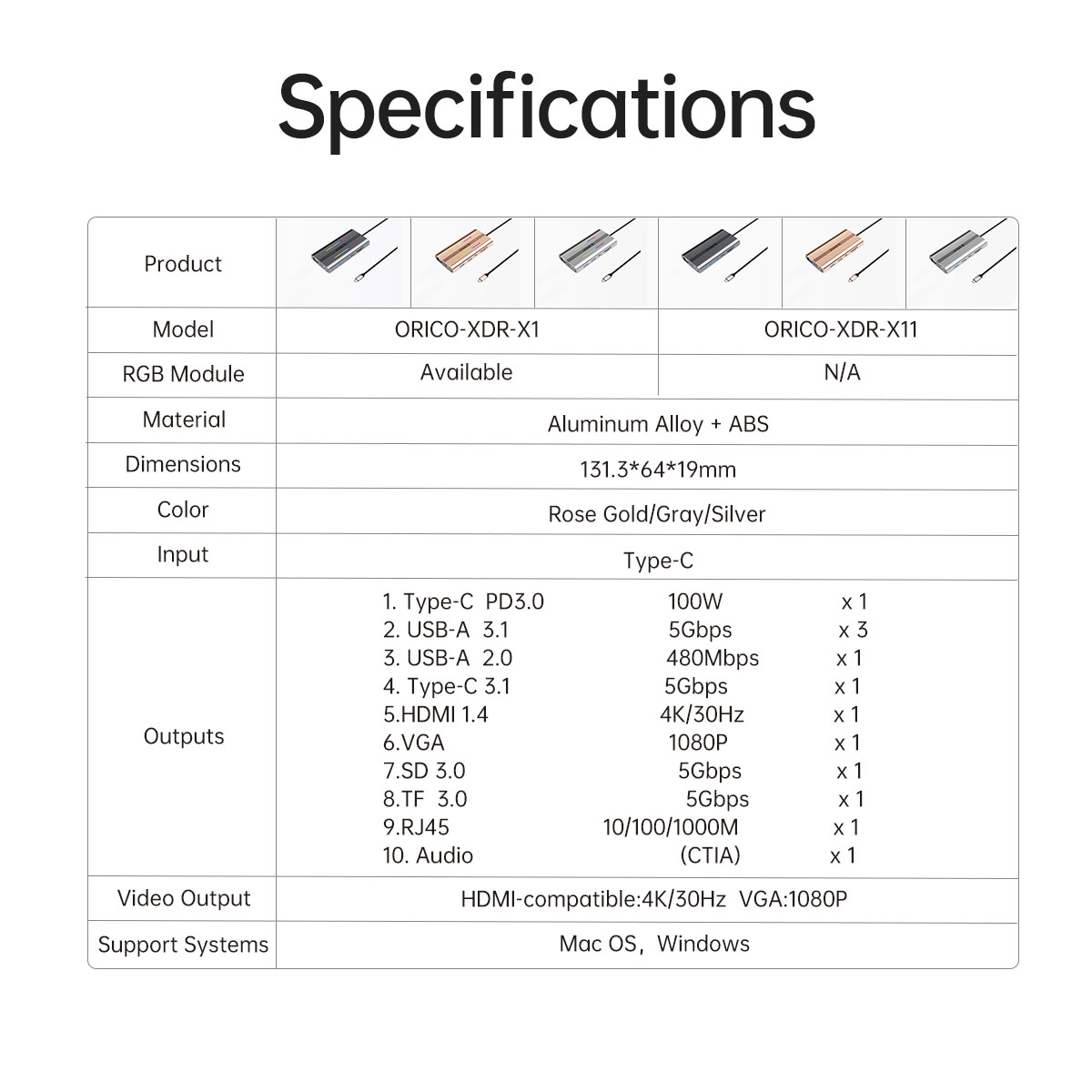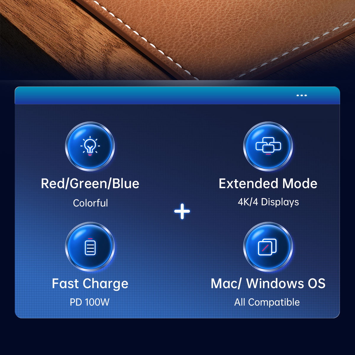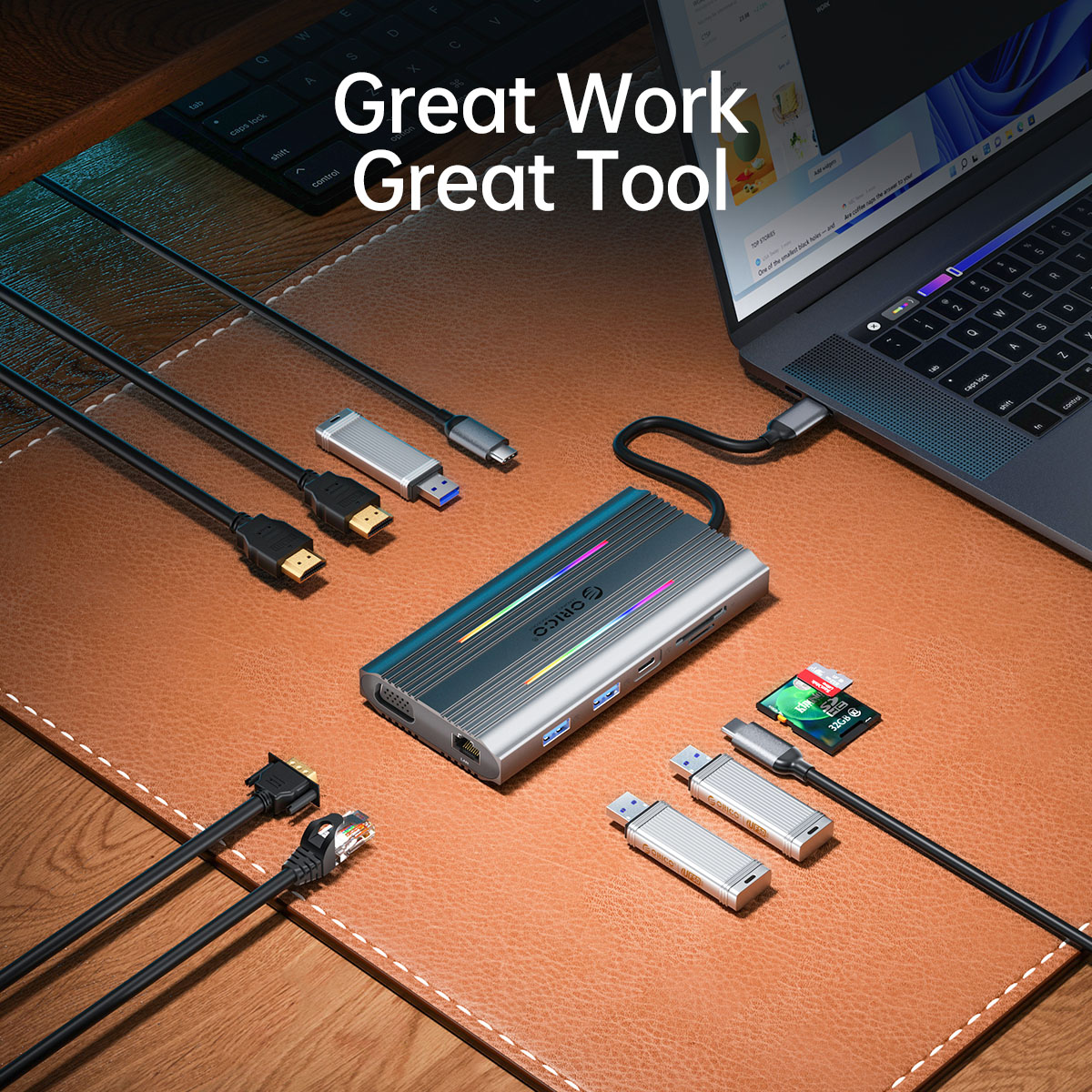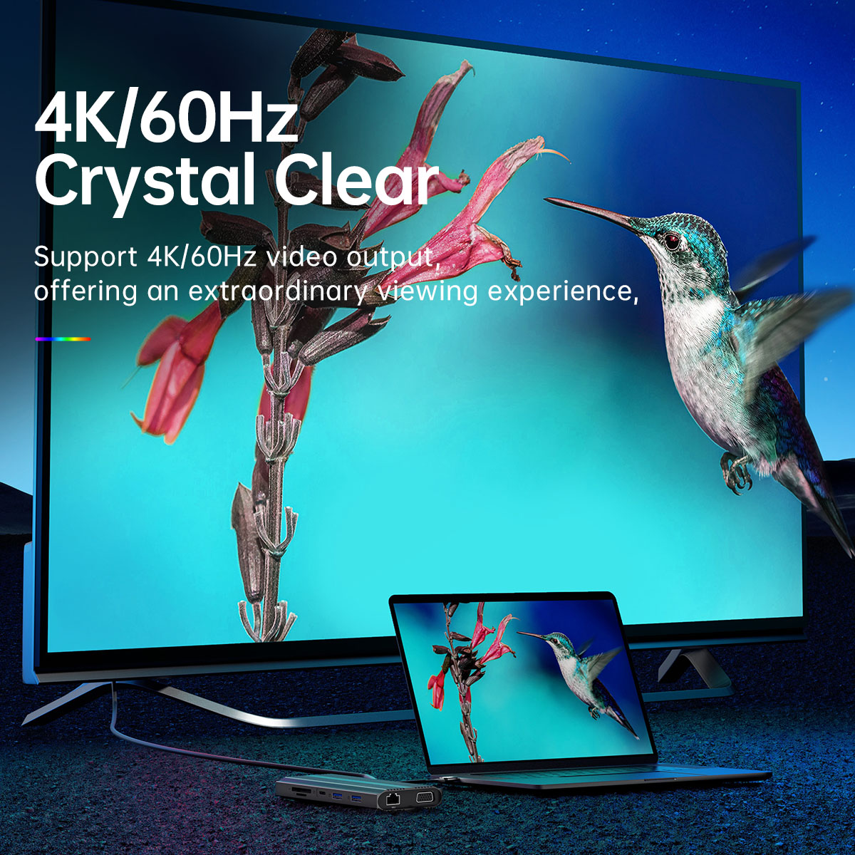 1.Type-C PD3.0 100W x 1 2.USB-A 3.1 5Gbps x 2 3.USB-A 2.0 480Mbps x 1 4.Type-C 3.1 5Gbps x 1 5.HDMI 2.0 4K/60Hz x 2 6.DP 1.4 4K/60Hz x 1 7.SD 3.0 5Gbps x 1 8.TF 3.0 (TF/SD) 5Gbps x 1 9.RJ45 10/100/1000M x 1 10.Audio (CTIA) x 1