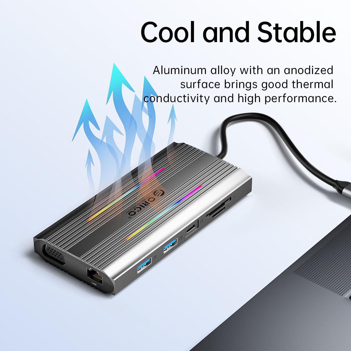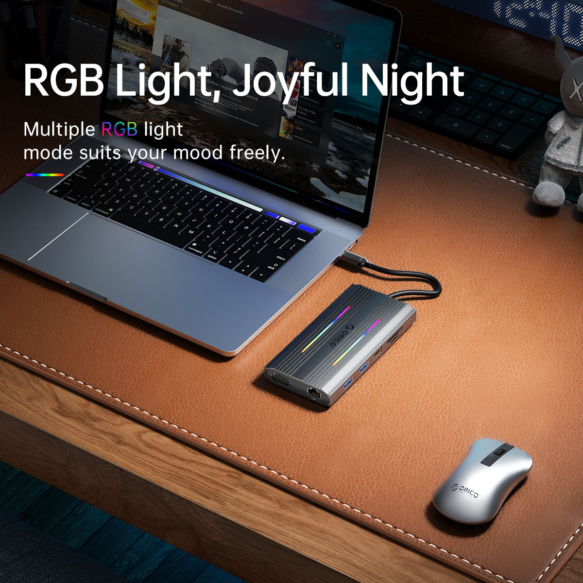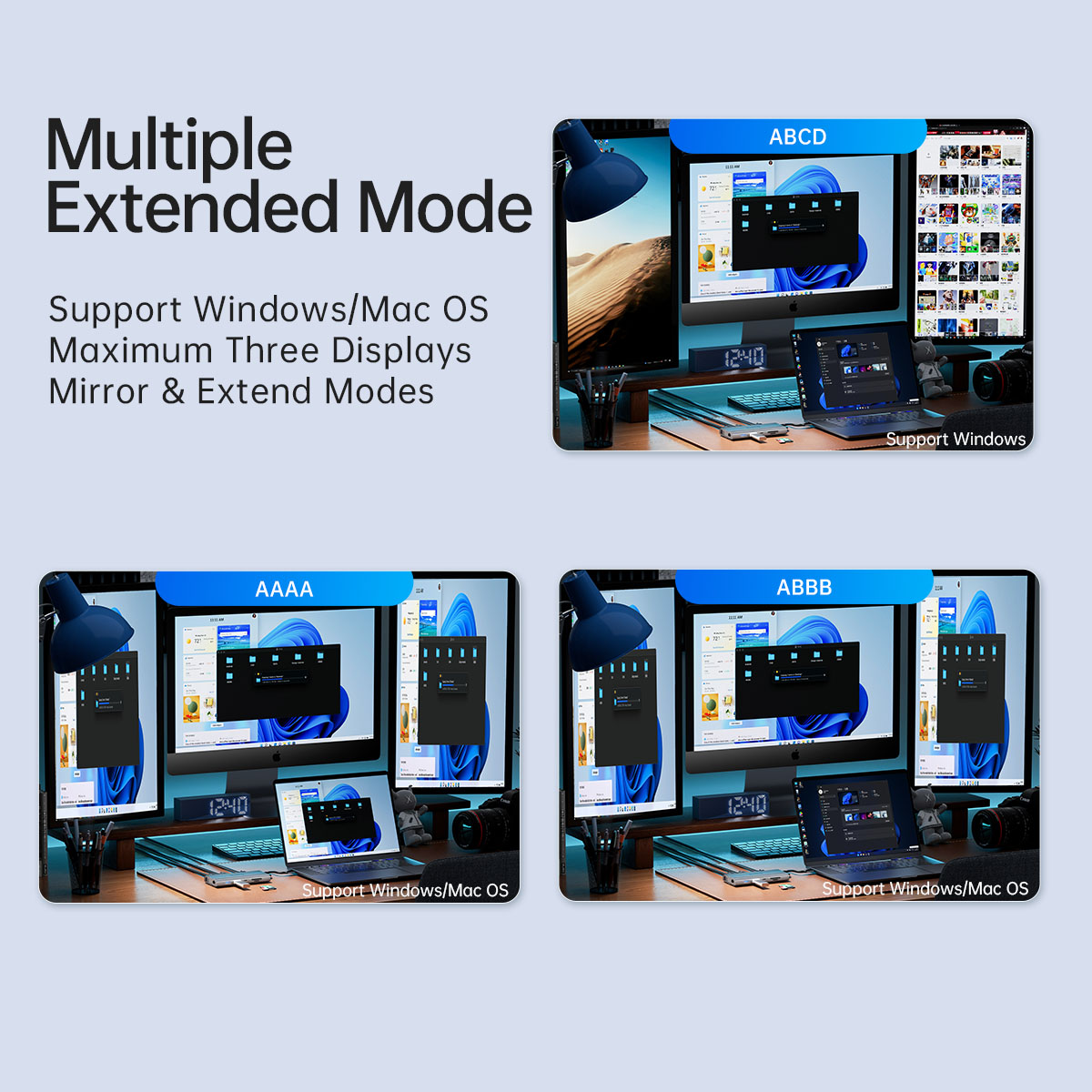 1.Type-C PD3.0 100W x 1 2.USB-A 3.1 5Gbps x 2 3.USB-A 2.0 480Mbps x 1 4.Type-C 3.1 5Gbps x 1 5.HDMI 2.0 4K/60Hz x 2 6.DP 1.4 4K/60Hz x 1 7.SD 3.0 5Gbps x 1 8.TF 3.0 (TF/SD) 5Gbps x 1 9.RJ45 10/100/1000M x 1 10.Audio (CTIA) x 1