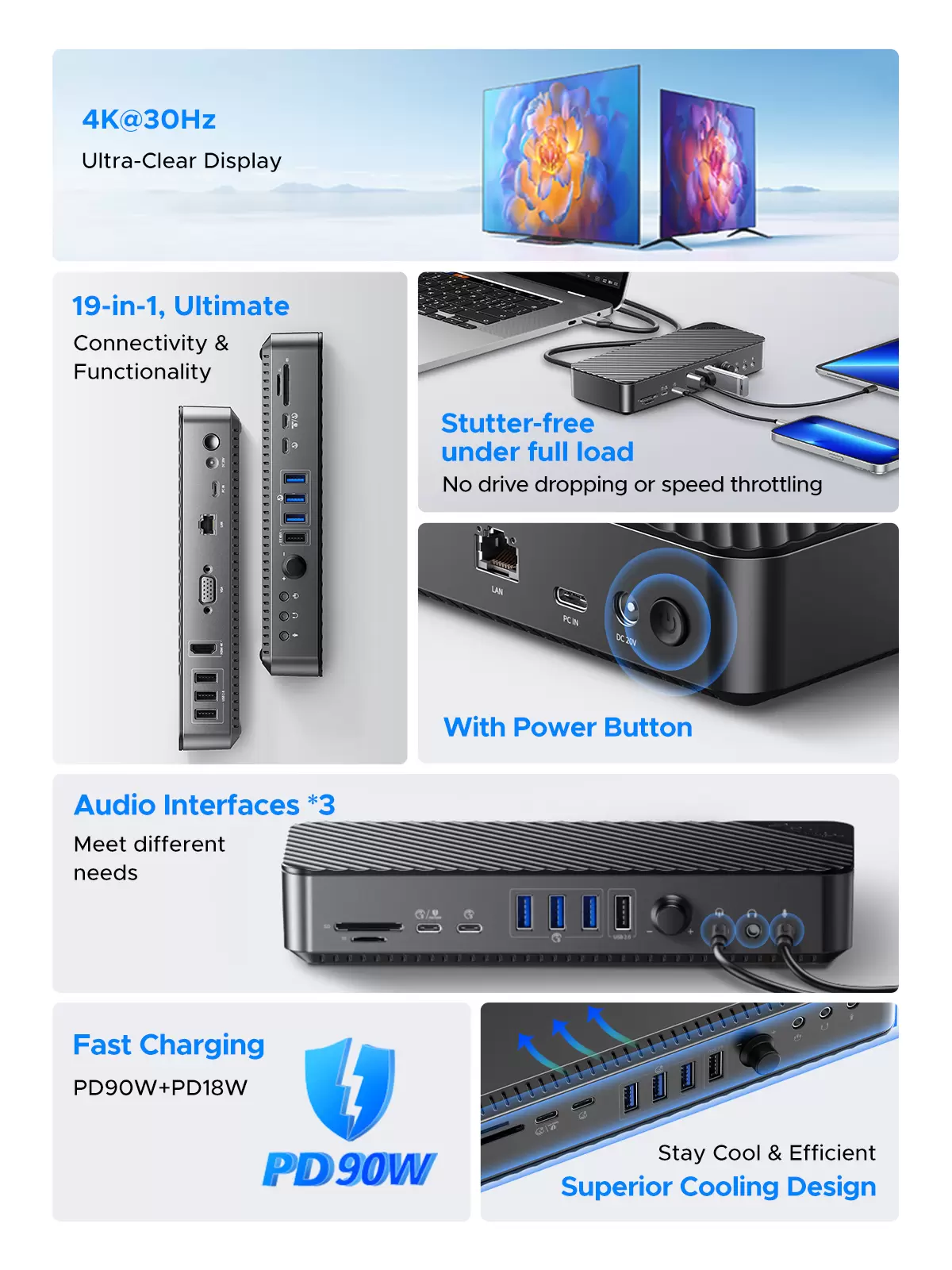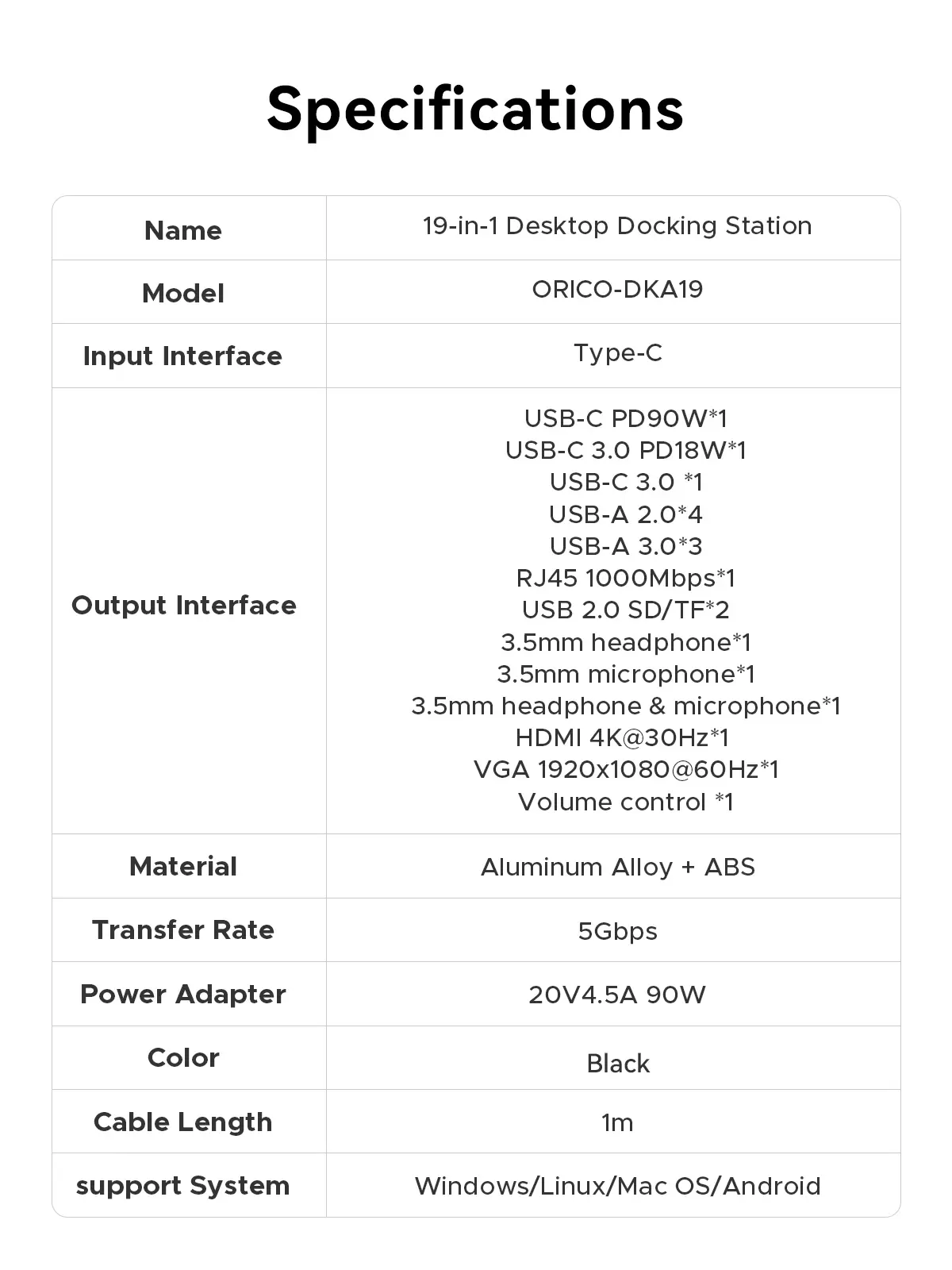 USB-C PD60W*1, USB-C 3.0 PD18W*1, USB-C 3.0 *1, USB-A 2.0*4, USB-A 3.0*3, RJ45 Interface*1, USB 2.0 SD/TF*2 (Not Simultaneous), 3.5mm Headset Jack*1, 3.5mm Mic Jack*1, 3.5mm Mic/Headset Jack*1, HDMI 4K@30Hz*1, VGA 1920x1080@60Hz*1, Volume Adjustment Knob*1