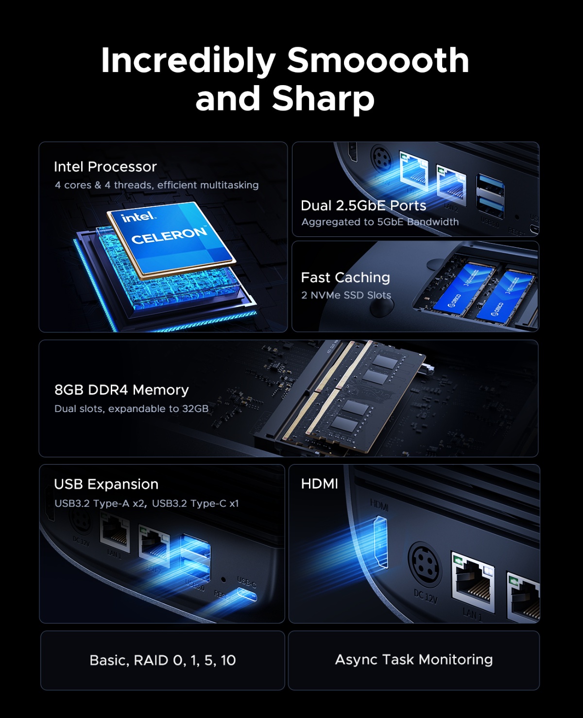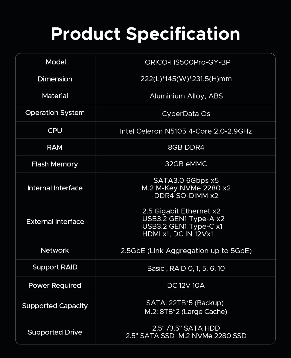 2.5" /3.5" SATA HDD, 2.5" SATA SSD, M.2 NVMe 2280 SSD