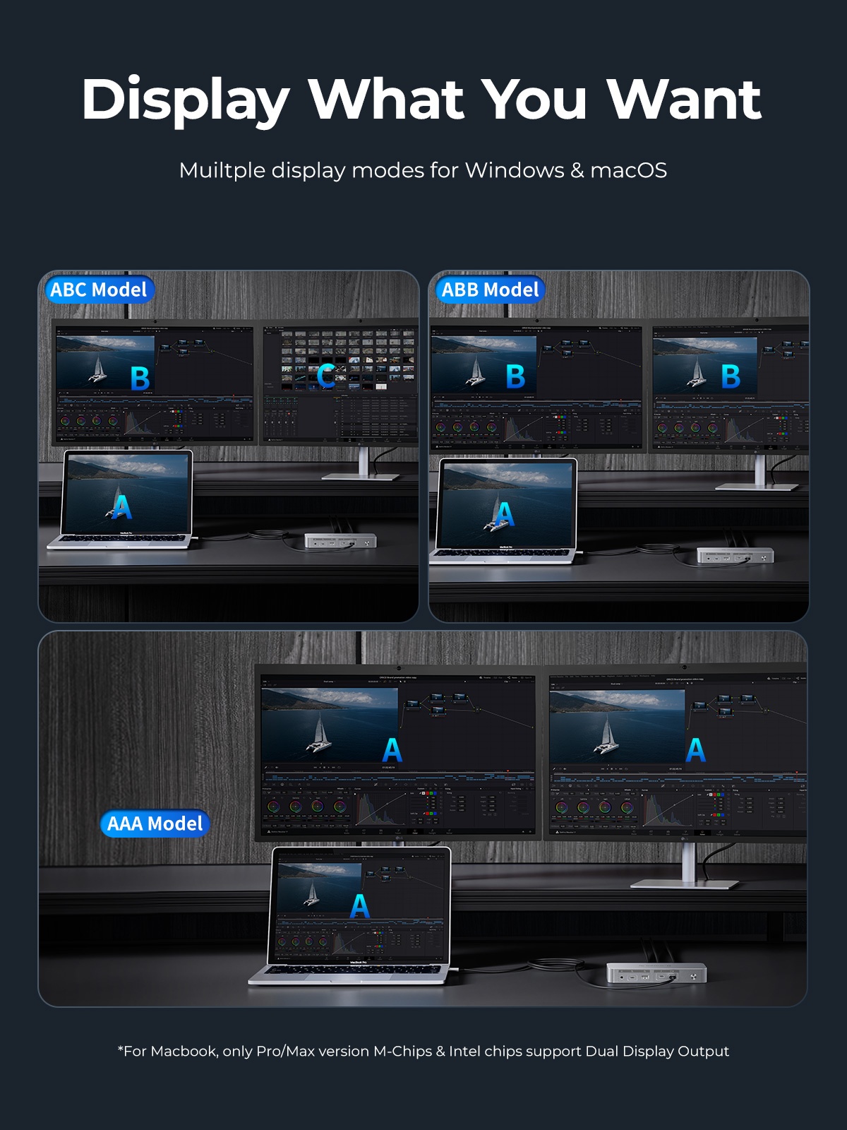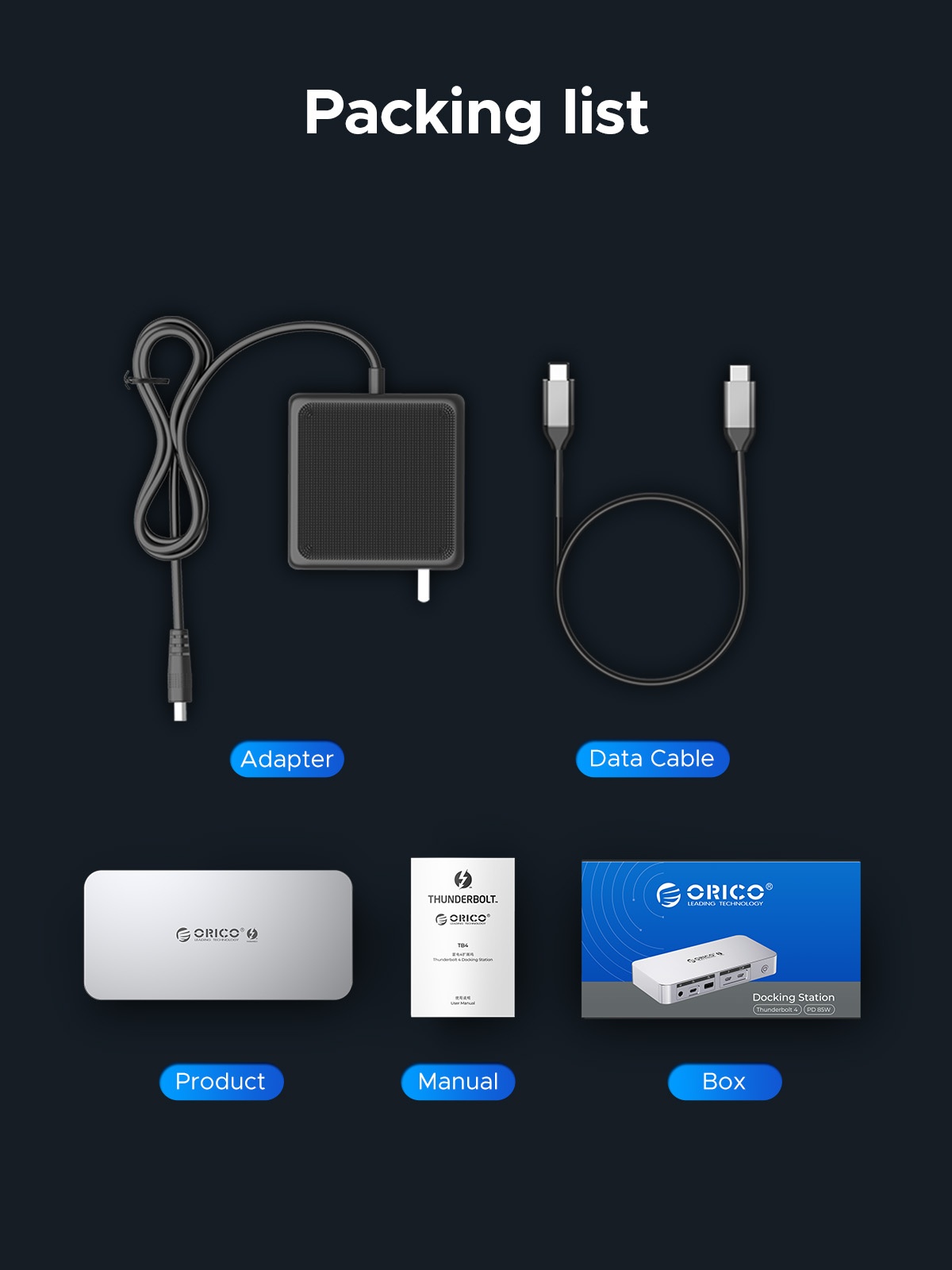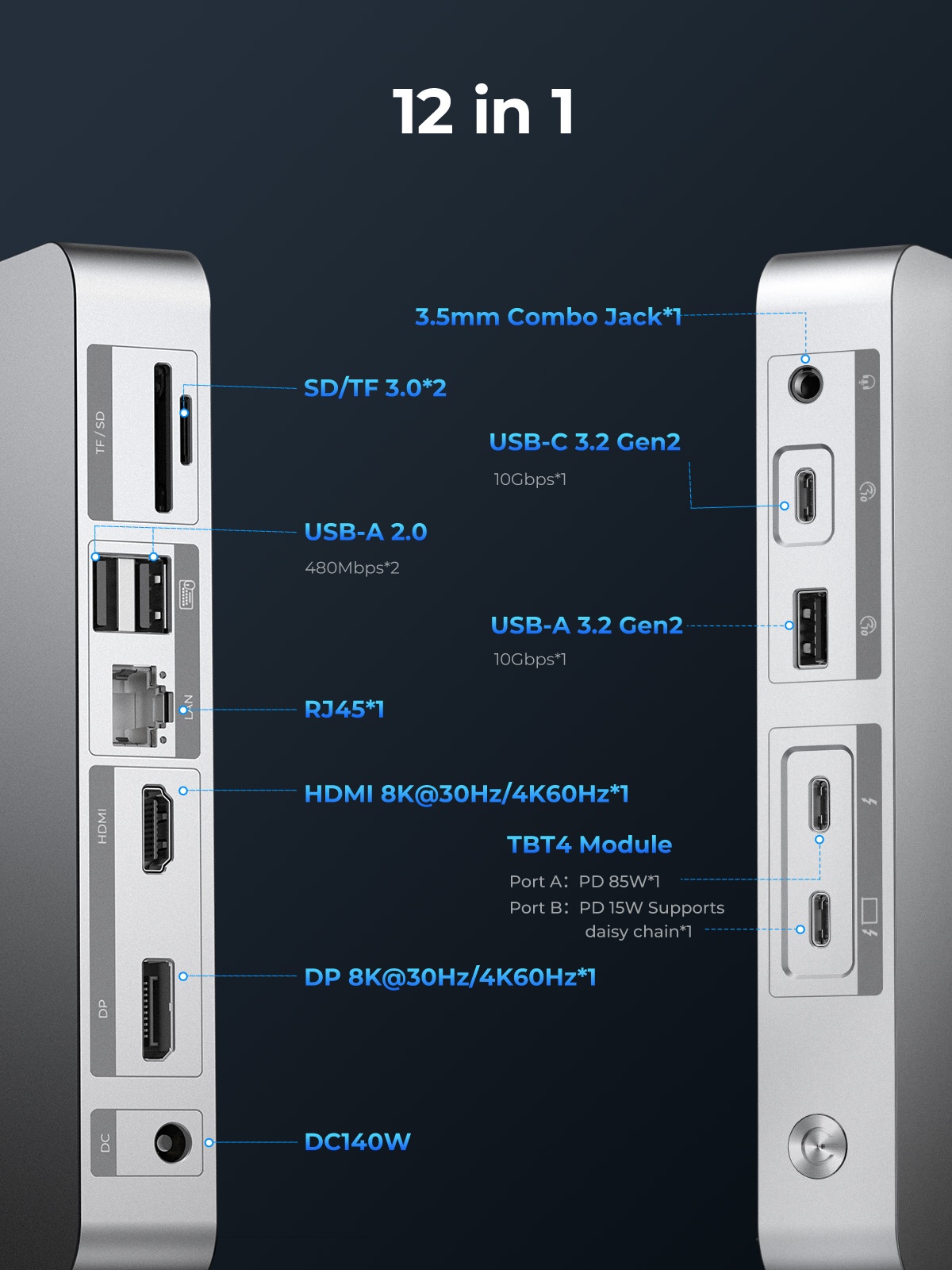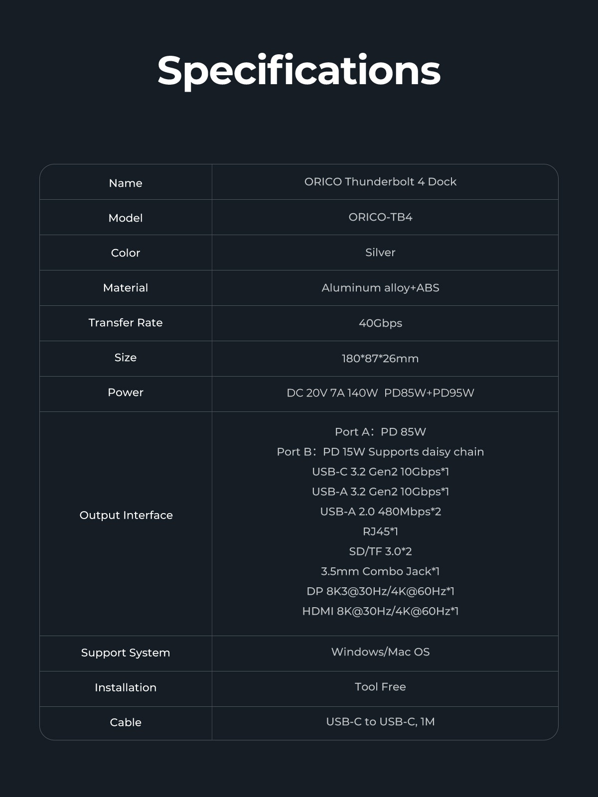Thunderbolt 4 Uplink Interface PD 85W, Thunderbolt 4 Downstream Interface PD 15W Support daisy chain, USB-C 3.2 gen2 10G*1, USB-A 3.2 gen2 10G*1, USB-A 2.0 480Mbps*2, RJ45 Gigabit Ethernet port, SD/TF 3.0 card slot, 3.5MM earphone integrated interface, DP 1.4 8K30HZ/4K60HZ, HDMI 2.0 8K30HZ/4K60HZ