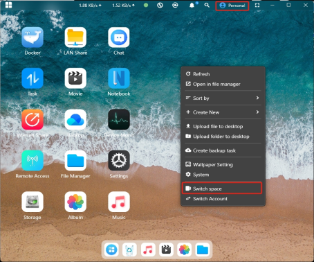 · It’s like a personal space requires secondary password verification, so that it ensures double data security. Right click on the desktop and select “switch space”or click “personal space” and choose “private space” in the upper right corner to switch.