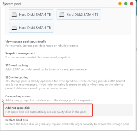 Note: Only storage pools that support the failure of one or more hard drives and have a RAID array configured can add hot spare disks!