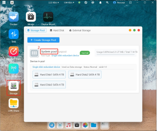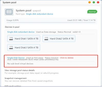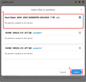 · Click "Storage Manager" on the homepage, then select the storage pool where you want to add a hot spare disk (e.g., "System Storage Pool") to enter the storage pool management interface. · Select the hard drive you want to add as a hot spare disk, click "Select," and complete the addition.