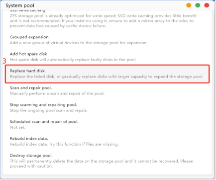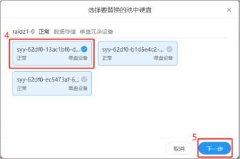 · Click "Settings" on the homepage, select "Storage Pool Management," and enter the storage pool management interface. Scroll down to see the "Replace Hard Drive" option. · After clicking "Replace Hard Drive," select the hard drive to be replaced and click "Next," as shown in the bottom-left image.