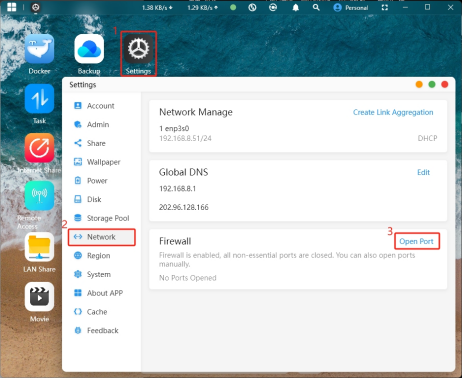 · Click "Settings" on the homepage, select "Network Management," and enter the network management interface. Click "Open Port" under the firewall to customize external ports · After setting the port, click "Submit" to apply.