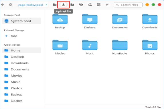 Click the "Upload File" icon above the folder, select the file in the pop-up folder window, and click "Open" to complete the file upload.