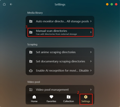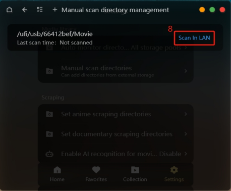 Click on the "Settings" at the bottom of the movie application, then click on "Manual Scan Directory" to enter the manual scan directory management.