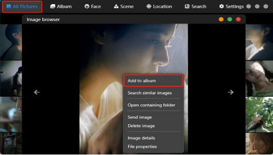 After creating the album, return to the all photos interface. Click on a photo and then right-click to add it to the newly created album. Once the photos are added, go back to the album interface to see that the album now contains the photos.