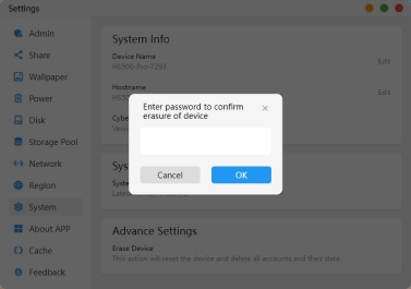 · Click "Settings" on the homepage, select "System Settings," and enter the system information interface. Under "Advanced Settings," click "Erase Device." Enter the password in the pop-up window and click "Confirm Erase."